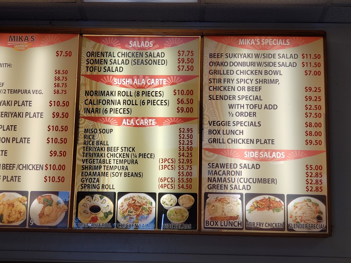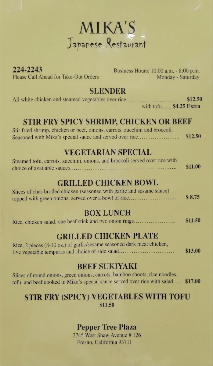 Mika’s Japanese Restaurant offers a straightforward and approachable menu that focuses on satisfying, casual meals with a touch of comforting familiarity. The selections reflect a balance between hearty dishes and lighter options, ideal for a quick lunch break or a relaxed dinner without fuss. Expect dishes like teriyaki chicken bowls, vegetable tempura, and classic ramen, each serving as a simple, flavorful option that fits well in a cozy, welcoming environment.